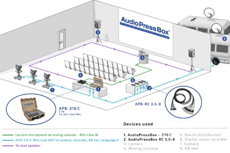 AudioPressBox APB-216C, hem iç, hem de dış mekan basın toplantıları için uygun yapıda dizayn edilmiş, profesyonel, özel çantası ile taşınabilir ve aktif bir basın dağıtım (audio splitter) ünitesidir.
